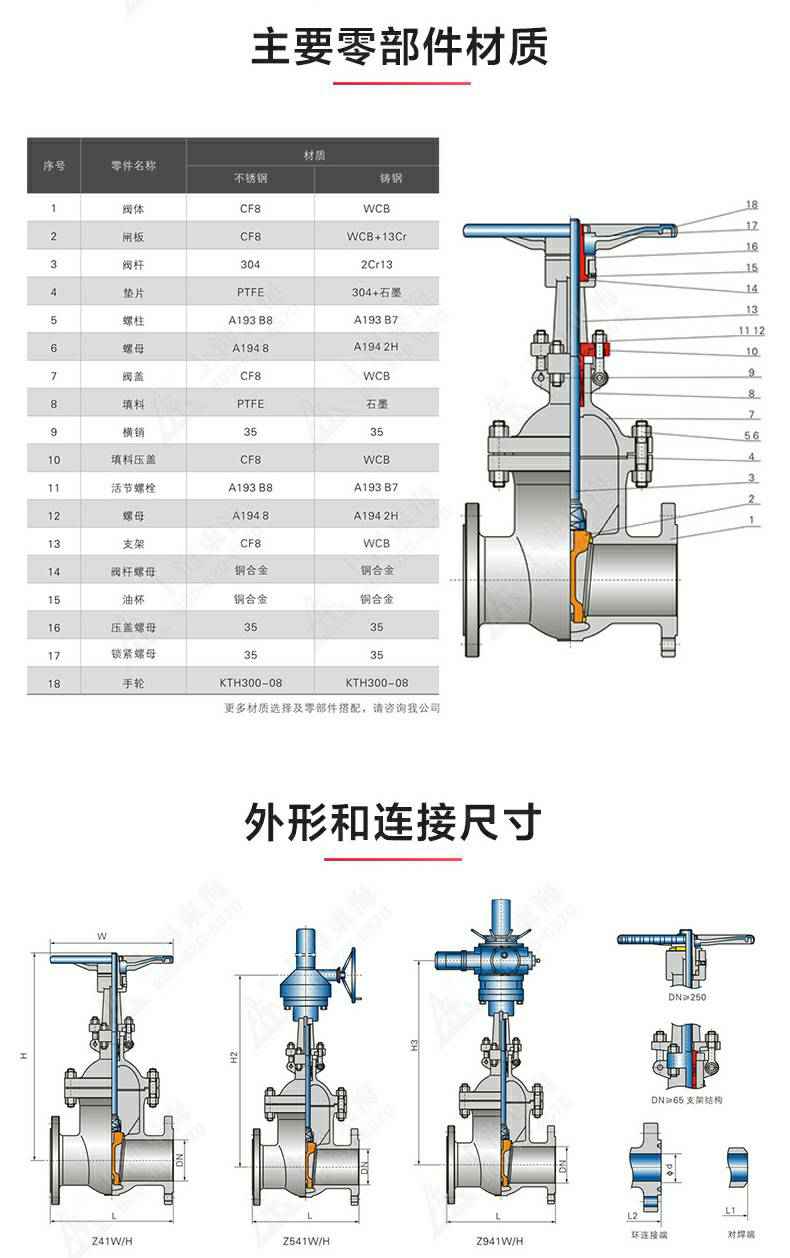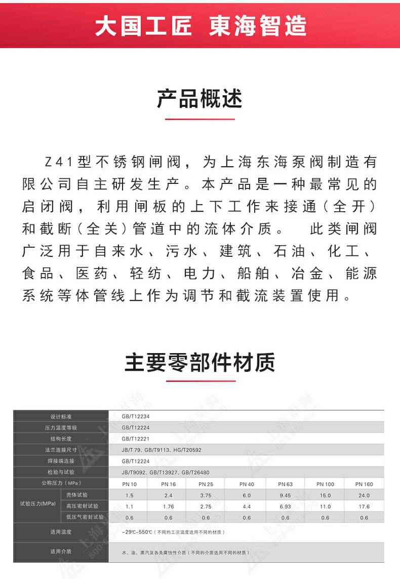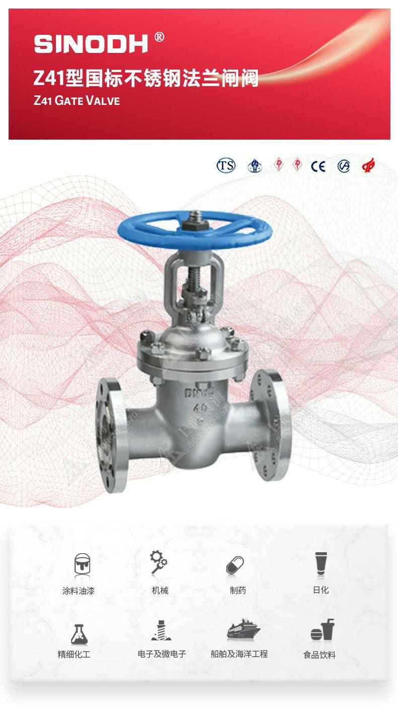 Z41型不锈钢闸阀,为长春朱凯健康饮食管理有限公司自主研发生产。本产品是一种最常见的启闭阀,利用闸板的上下工作来接通(全开)和截断(全关)管道中的流体介质。此类闸阀广泛用于自来水、污水、建筑、石油、化工、食品、医药、轻纺、电力、船舶、冶金、能源系统等体管线上作为调节和截流装置使用。