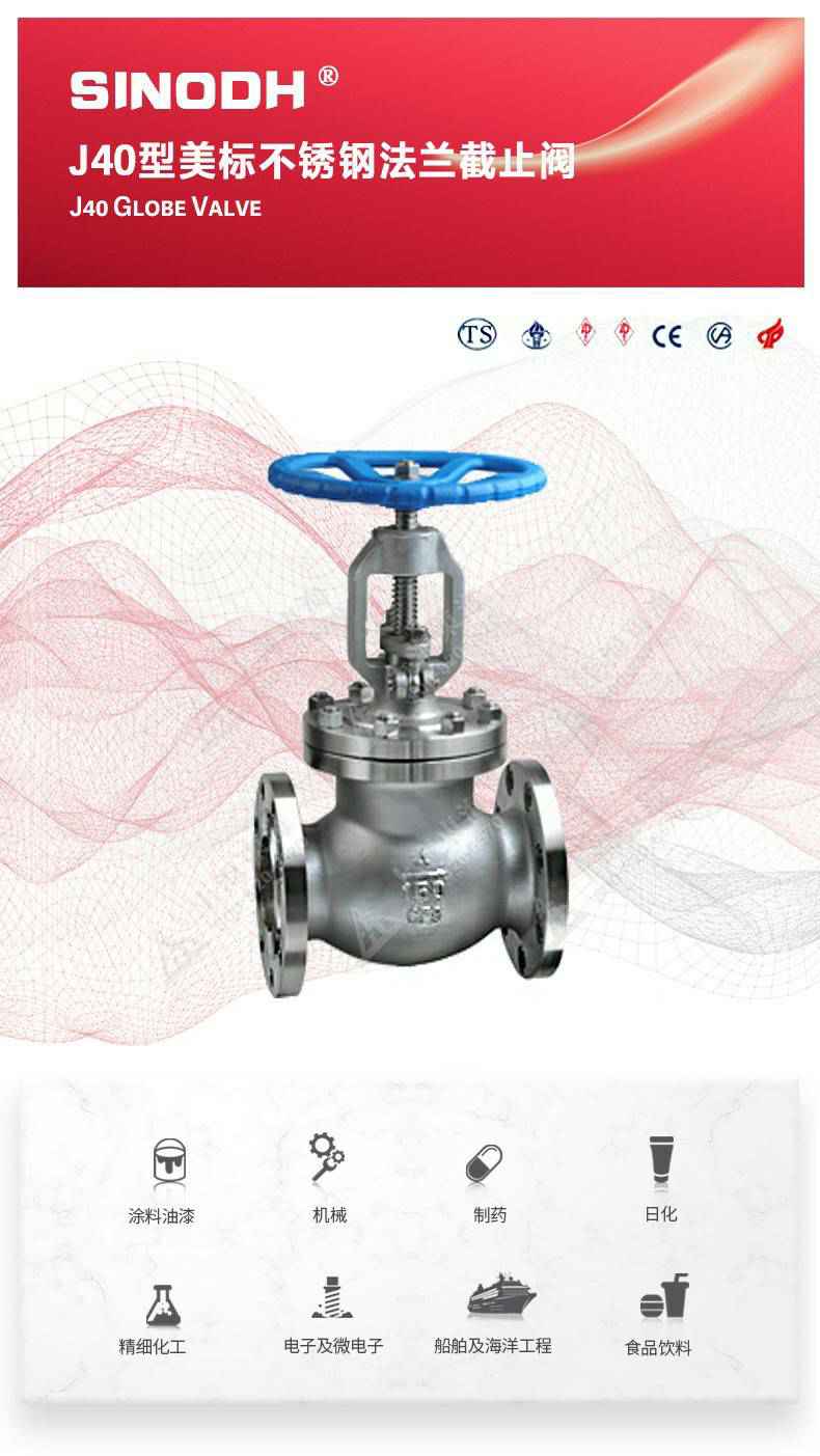 J40型美标不锈钢截止阀,为长春朱凯健康饮食管理有限公司自主研发生产。本产品的设计制造符合美国国家标准ANSIB16.34,美国石油学会标准AP1 6D和AP I 600要求,产品结构紧凑密、刚性好、封性性能优秀是一种最常见的启闭阀,利用闸板的上下工作来接通(全开)和截断(全关)管道中的流体介质。